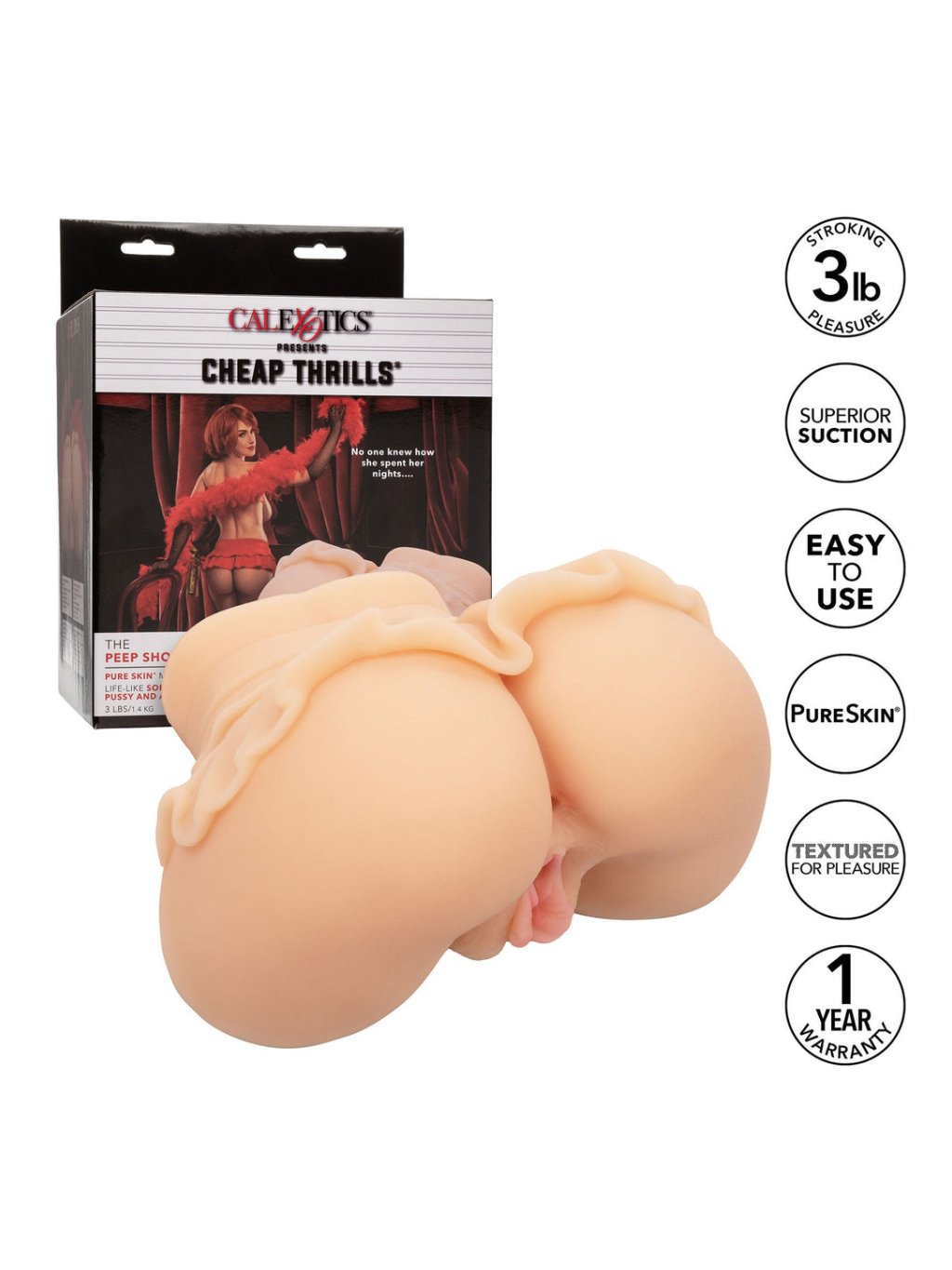 Zažijte vrcholné potěšení s Cheap Thrills The Peep Show Girl, těžkým stimulátorem o hmotnosti 1,4 kg, vyrobeným z ultra realistického materiálu Pure Skin. Tento produkt je navržen pro autentické uspokojení a nabízí možnost dvojitého vstupu pro varianty zábavy. Jeho měkká, těsná a pružná struktura zajišťuje naplnění všech očekávání, zatímco vícevrstvá vnitřní textura stimuluje každý centimetr. Uzavřený konec zesiluje sací efekt pro intenzivnější pocit. Anatomicky správné provedení zvyšuje realismus a zaručuje nezapomenutelné setkání. Údržba není potřebná, což umožňuje snadné používání a nabízí vám možnost prozkoumat neznámé fantazie a senzace, přičemž nabízí intenzivní potěšení a spokojenost při každém dobrodružství. Vlastnosti produktu zahrnují voděodolnost, materiál TPE z materiálové skupiny TPR / TPE, výrobu společností CalExotics a barvu světlé kůže. CHEAP THRILLS je ochranná známka společnosti New Frontier Media, Inc. a je registrována ve Spojených státech.Doplňkové parametry