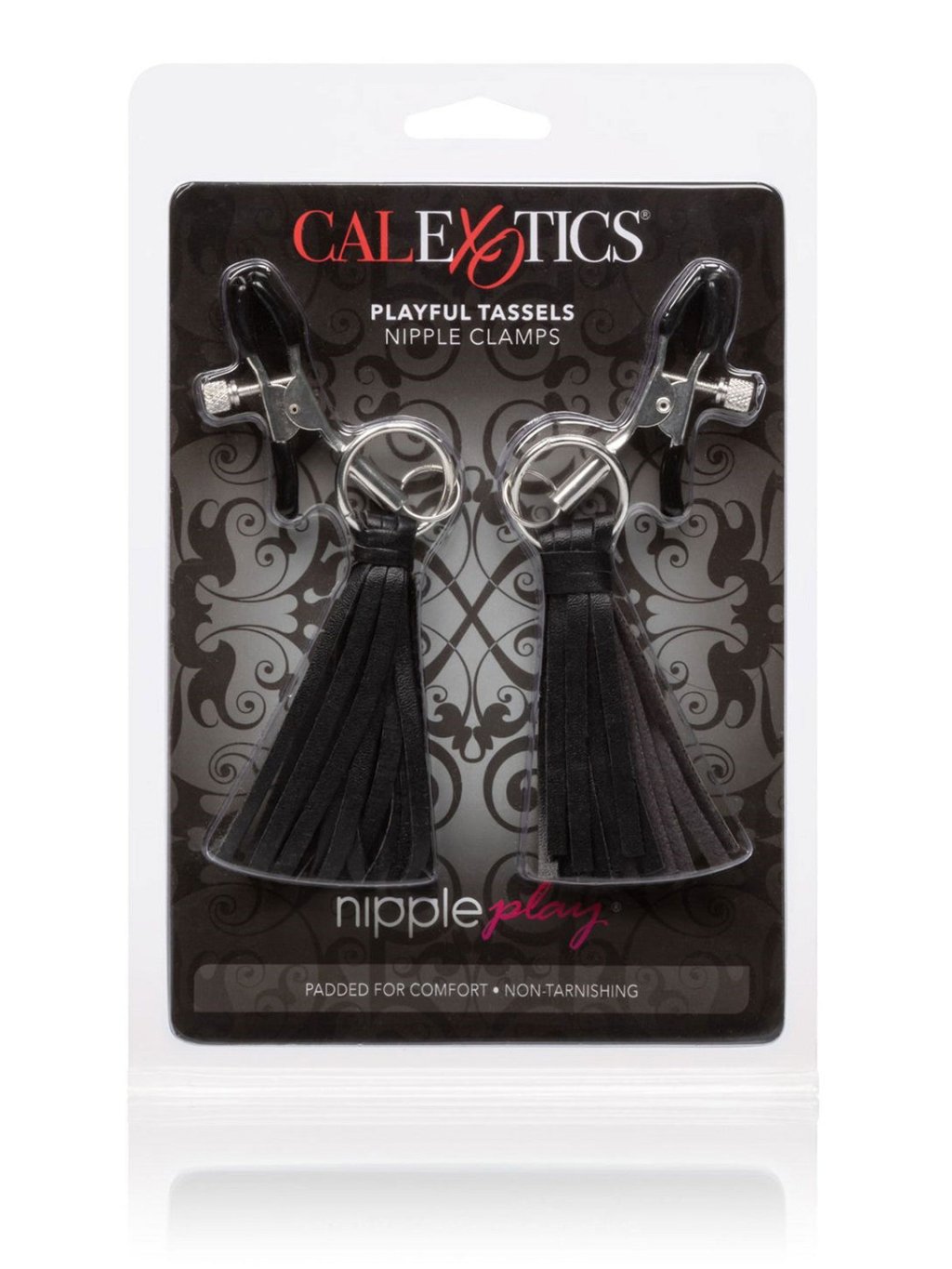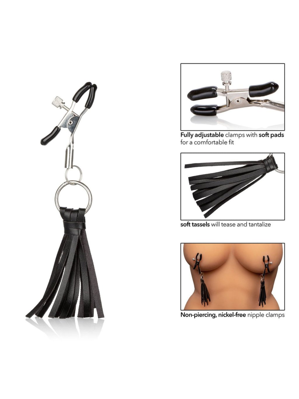Objevte svou stylově kinkovní stránku a posuňte hranice bolestného potěšení s Nipple Play® Playful Tassels Nipple Clamps. Zkušení fetišisté i začínající mohou ponořit své smyslné hrátky s bradavkami do této lákavé sady s třásněmi. Zatímco měkké veganské třásně dráždí pokožku vašeho milence pro napínavé dráždění, nastavitelné svorky na bradavky stupňují intenzitu s jemným zvratkem. Měkké PVC polštářky a nastavitelné napětí svorek vám umožňují objímat tenkou hranici mezi potěšením a bolestí pro hříšně senzorický zážitek. Přenesete tak i své nejprovokativnější erotické sny do reality a ponoříte se hluboko do svých nejvášnivějších touh. Materiály: bezniklová ocel (svorky, kroužky), PU (třásně), PVC bez ftalátů (polštářky). Skupina materiálů: kov. Výrobce: CalExotics. Barva: černá.