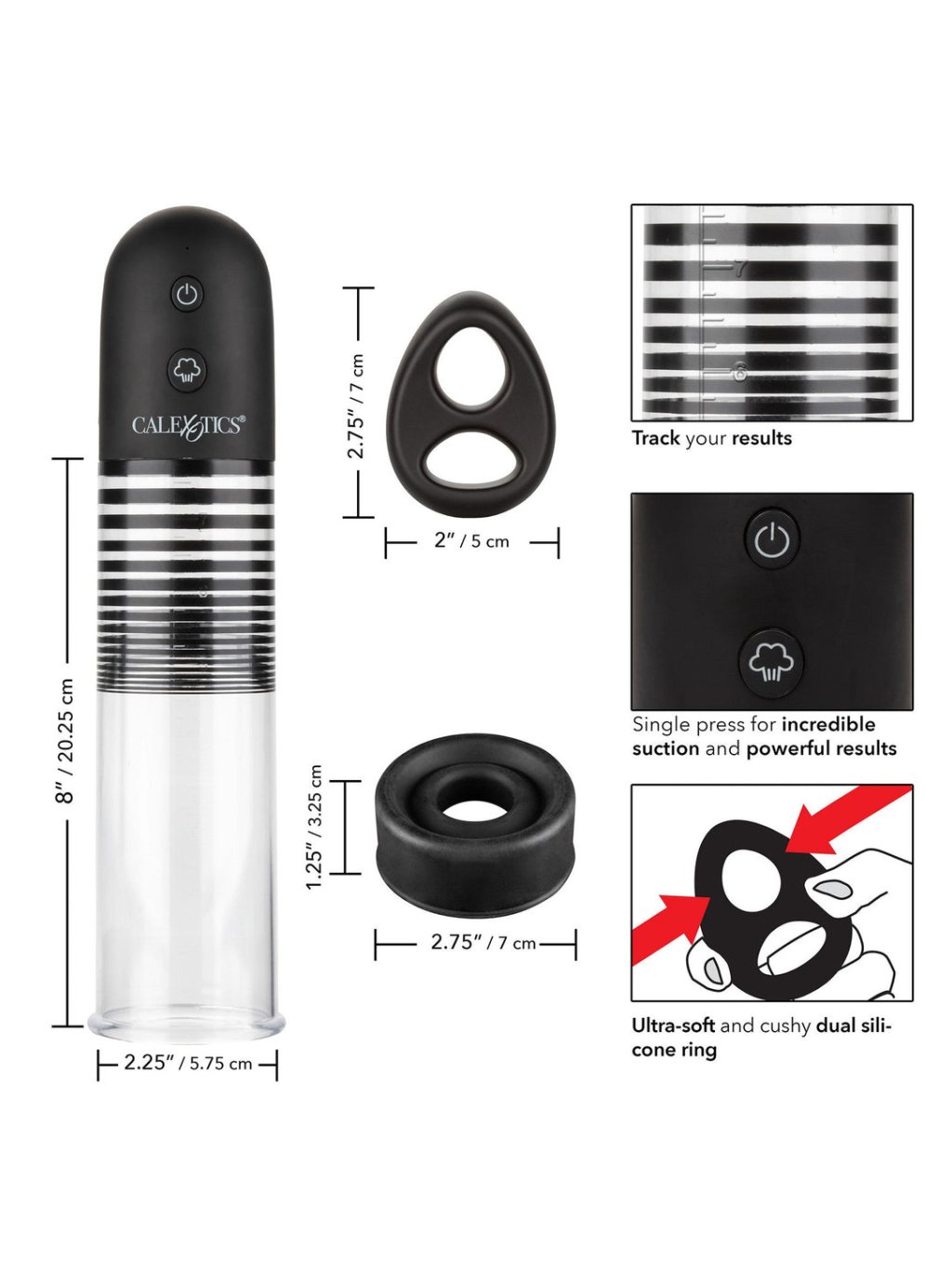 Využijte svůj potěšitelský nástroj naplno s sadou Optimum Series Rechargeable EZ Pump Kit, která zahrnuje elegantní automatickou pumpu s ultra-měkkým duálním silikonovým kroužkem. Zvyšte vytrvalost, zlepšete výdrž a zvětšete svůj nástroj s výkonným nasáváním pomocí jediného tlačítka. Tato jednoduchá pumpa disponuje ovládáním na dotek a tlačítkem pro rychlé uvolnění vzduchu, což umožňuje individuální nastavení nasávání. Vylepšete svůj trénink tím, že si nasadíte ultra-měkký zvýrazňující duální kroužek, super měkký silikonový penisový kroužek pro senzacionální zvýraznění. Tlustý otevřený koncový rukáv a těsná, drsně vyčleněná komora vám poskytnou hříšné potěšení ze stahování s pumpou i bez ní. Neusadíte se nikdy s méně, pokud jde o velikost svého potěšení s sadou Optimum Series. Válcovitá pumpa a tlustý, odolný rukáv jsou navrženy tak, aby vytvořily dokonalé těsnění a výkonné nasávání jediným stisknutím tlačítka. Jakmile dosáhnete svého vrcholu, použijte rychlé uvolnění vzduchu k snížení nasávání nebo uvolnění těsnění. Při pravidelném používání vám tato výkonná pumpa může zvýšit vytrvalost, zlepšit celkovou velikost a zvýraznit pocit. Dobijte prémiovou pumpu během 2 hodin s dodaným USB nabíjecím kabelem a užijte si 3 hodiny vášnivého nasávání. Pro sledování pokroku použijte inkrementální měřicí značky na hřídeli válce. Prémiový rukáv se hodí do většiny standardních pump, ale lze ho použít samostatně pro vášnivý zážitek ze stahování. Prémiový TPR je bezpečný pro tělo, neparfémovaný a bez ftalátů, aby udržel vaše nejcitlivější místa šťastné a zdravé. Snadno se čistí s touto údržbou zdarma stimulačním rukávem, stačí ho opláchnout mýdlem a teplou vodou před a po každém použití. Pro snadné zavedení použijte dostatek lubrikantu.