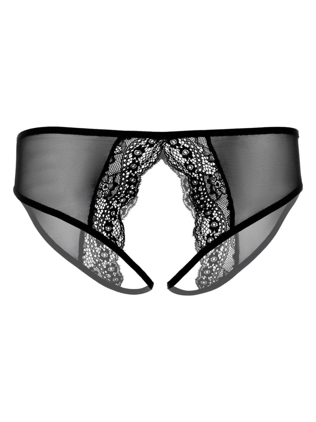 Podvazkové kalhotky Inez s otevřeným rozkrokem – dokonalá kombinace pásů a krajky.