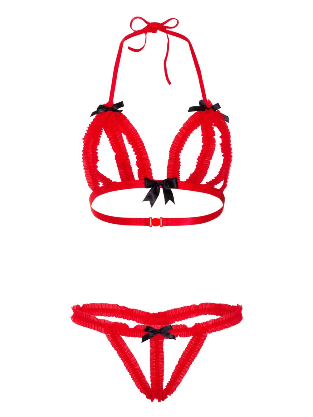 Podprsenka a kalhotky s odkrytým rozkrokem - Svůdná podprsenka s odkrytými kalhotkami. Ženská jemná krajka s designem srdce, všechny popruhy jsou elastické a nastavitelné pro...