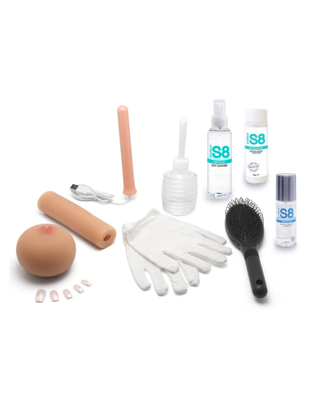 Das Paket enthält zwei Sets frecher Unterwäsche, S8 Quality Reiniger, S8 Silky Gleitmittel, S8 Renewal Puder, weiße Baumwollhandschuhe für den Umgang mit der Puppe, ein Ersatznagelset, einen USB-Heizstab, einen Reinigungs-Irrigator, eine Haarbürste und eine Anleitung.