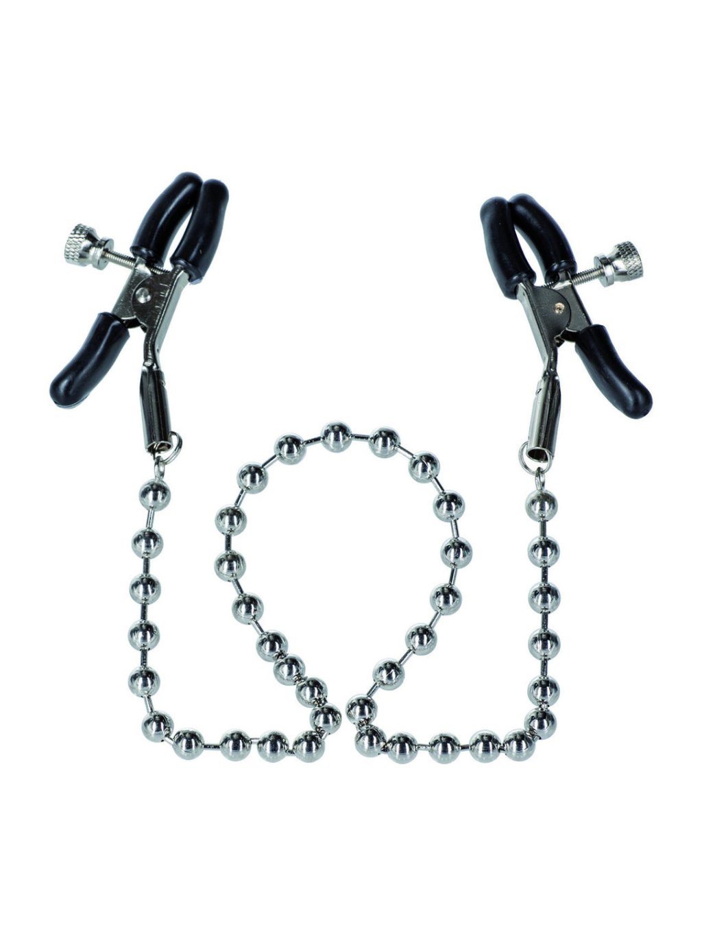 Silberne Brustwarzenklemmen mit Perlen sind das ideale Zubehör für empfindliche Brustwarzenstimulation und befriedigendes verlängertes Brustwarzenspiel. Einfach zu drückende, voll einstellbare Klemmen sind ideal sowohl für Anfänger als auch für erfahrene Benutzer, die erotisches Vergnügen und Schmerz erkunden möchten. Verwenden Sie die Mini-Klemmen für direkte Stimulation und Vergnügen der Brustwarzen oder anderer sehr empfindlicher Körperbereiche. Die einfach zu verwendenden Klemmen sind aus rostfreiem, nickelfreiem Eisen gefertigt und haben weiche, bequeme PVC-Polster ohne Phthalate für angenehmes Tragen. Voll einstellbare Mini-Klemmen messen 2”/5 cm und sind mit einer robusten Kette mit Perlen in hochwertiger Silberfarbe verbunden. Um den Druck beider Brustwarzenklemmen einzustellen, drehen Sie einfach die Schrauben, um orgasmische, prickelnde Empfindungen zu intensivieren. Die aufregenden, mit Silikon beschichteten Klemmen sind eine großartige Ergänzung für Ihre intime Spielzeugsammlung. Entdecken Sie Ihre Fetisch-Fantasien. Das feminine Design mit Perlen spricht submissive Liebhaber an, die das Kitzeln des Brustwarzenspiels genießen. Um ultra-empfindliche Empfindungen zu verstärken, verwenden Sie ein Sensibilisierungsgel. Tragen Sie das Gel direkt auf die Brustwarze auf, bevor Sie die drückbaren Klemmen anbringen. Verführerische Wellen des Vergnügens garantieren ein orgasmisches Erlebnis. Reinigen Sie die Brustwarzenklemmen vor und nach jedem Gebrauch mit einem Spielzeug-Reinigungsspray.Zusätzliche Parameter