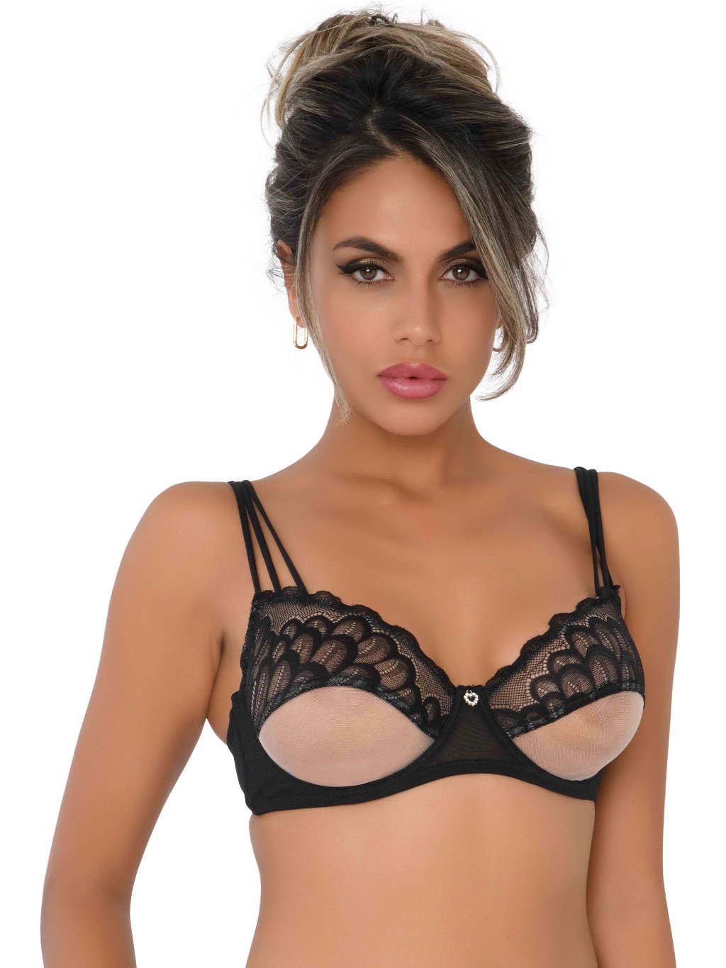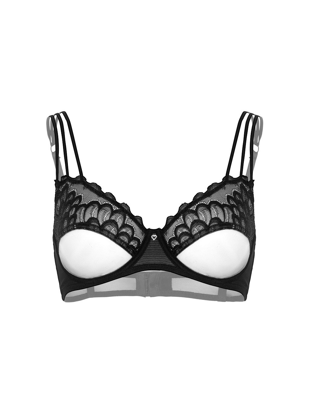 Ungefütterter BH mit falschem Unterbrustband, verziert mit feiner Spitze und transparentem Unterteil.
