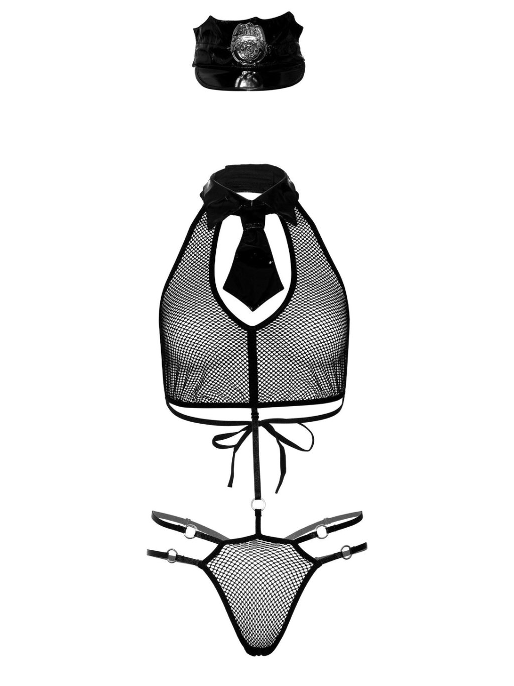 Naughty Police Roleplay Set ist ein Set für verspielte Polizeirollen, das ein Trikini mit transparentem Muster in sexy Netzoptik mit glänzendem Kragen und Krawatte, Metallringen und verstellbaren Trägern für perfekte Passform enthält. Ebenfalls enthalten ist eine Mütze mit Abzeichen. Das Material des Sets besteht aus 92% Polyamid und 8% Elasthan. Hersteller: Daring Intimates. Farbe: Schwarz.Pflege: Unter 40°C waschen, kein Bleichmittel verwenden, nicht im Trockner trocknen, nicht überhitzen, nicht chemisch reinigen.