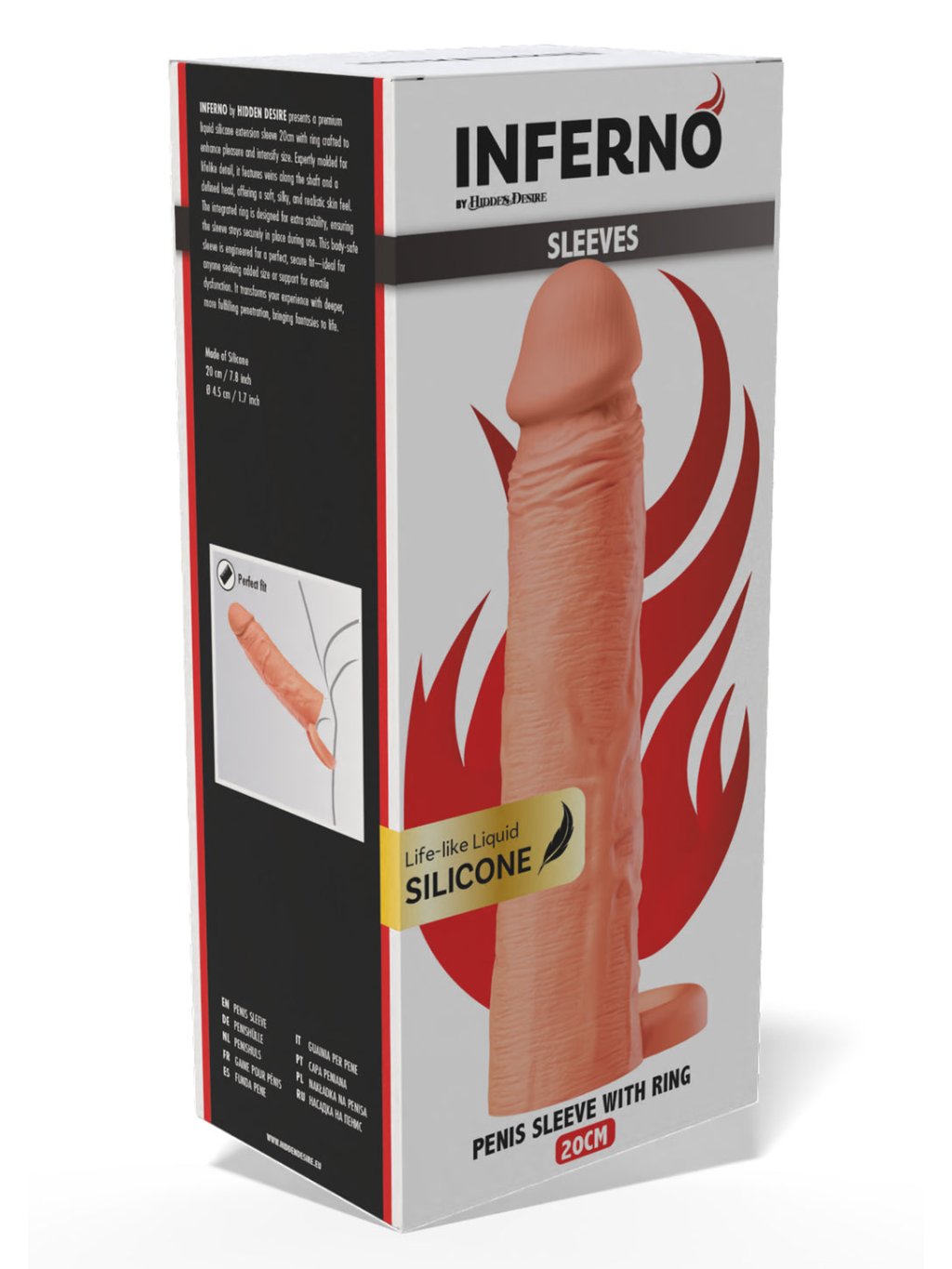 INFERNO by HIDDEN DESIRE präsentiert einen hochwertigen Verlängerungsaufsatz aus Flüssigsilikon mit 20 cm Länge und integriertem Ring für maximale Stabilität und Komfort. Der Aufsatz ist detailgetreu geformt – mit ausgeprägten Adern entlang des Schafts und einer anatomisch geformten Spitze. Die Oberfläche ist besonders weich, seidig und fühlt sich wie echte Haut an.