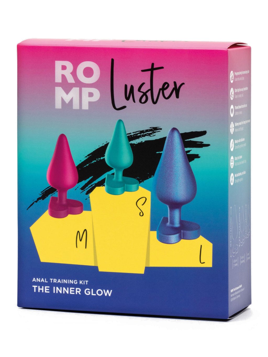 Dank dieses Sets können Sie stressfrei und mit voller Kontrolle neue Empfindungen entdecken und sich auf intensivere Analspiele vorbereiten. Ob Sie ein kompletter Anfänger sind oder neue Möglichkeiten der Lust suchen, ROMP Luster Anal Training Kit bringt Sie auf die nächste Ebene des Vergnügens!