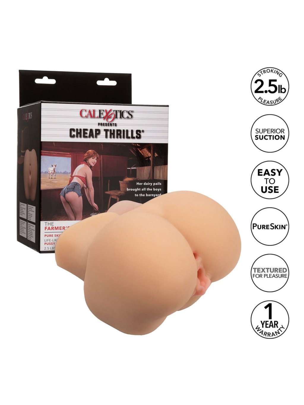 Experience an extraordinary adventure with the Cheap Thrills The Farmer's Daughter Masturbator from CalExotics. This 1.1 kg masturbator is made of Pure Skin material that perfectly mimics human skin, ensuring an ultra-realistic experience. Thanks to its dual design, it allows variable use for both front and back, with a soft, tight and flexible structure for multi-sensory perception. The inner chamber is equipped with various textures for precise stimulation, which is further enhanced by the closed end for a better suction effect. Anatomically correct design increases realism and promises an unforgettable encounter. The masturbator is also waterproof, which makes it easy to clean and maintain. The product does not require any maintenance, it is always ready to fulfill your fantasies and satisfy your desires. The lack of maintenance means you can spend more time realizing your vision of perfect pleasure. With Cheap Thrills The Farmer's Daughter you get 1.1 kg of pure pleasure for an intense stroking experience.
