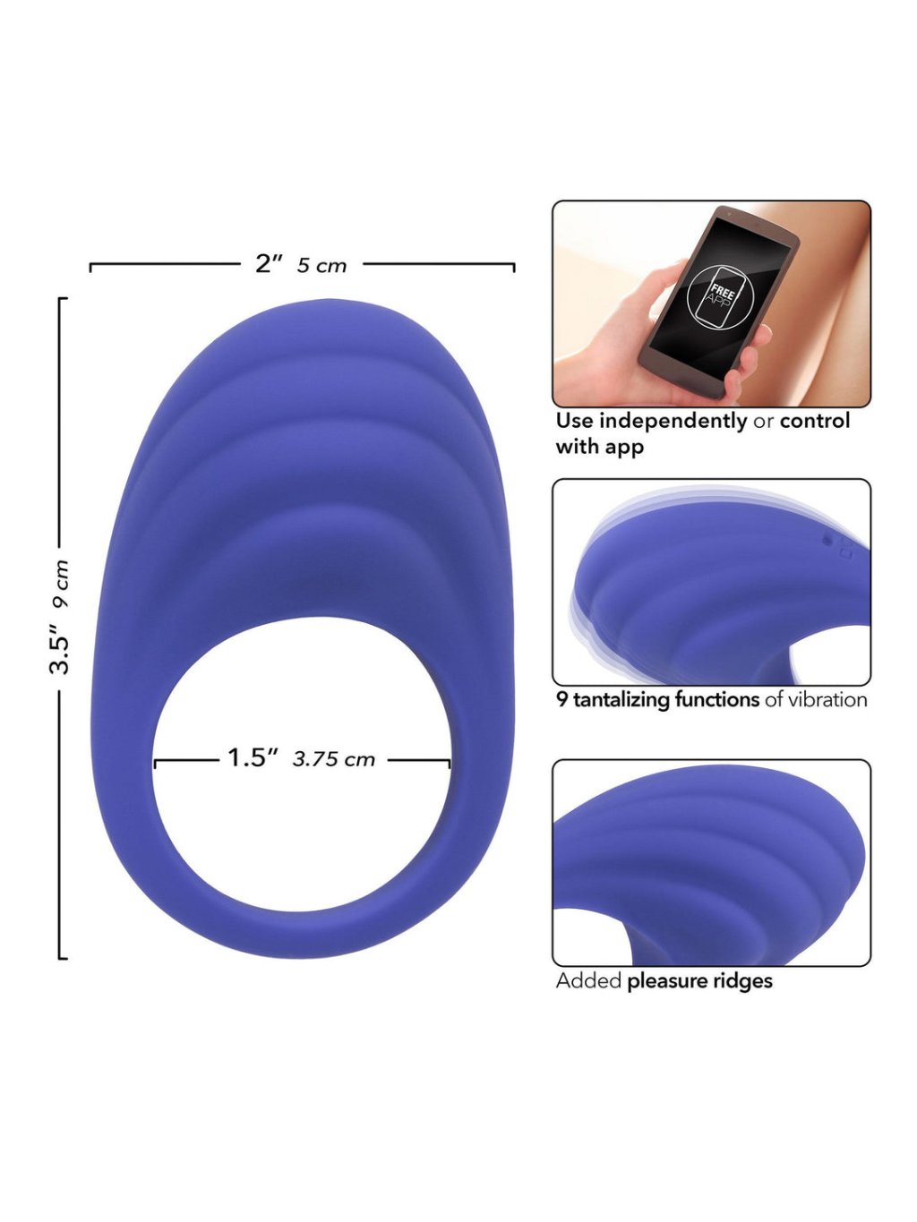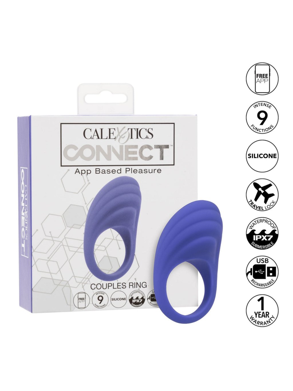 Introducing the CalExotics Connect couples ring, a revolutionary device for your intimate moments that you can control independently or via an easy-to-use app. This ring is made of body-safe silicone, is 100% waterproof, and offers nine vibration modes – from vibrations, through pulsations to escalations, which can be personalized for maximum pleasure. Equipped with fun ridges for additional excitement and an advanced memory chip, this ring remembers the last used function, allowing you to pick up right where you left off. With a safety travel lock that activates after holding the button for 3 seconds and USB rechargeable functionality with a 2-hour recharge time, this ring is the ideal travel companion. With a lithium-ion rechargeable battery, it provides up to 40 minutes of operation on high speed and 60 minutes on lower settings. Enjoy exciting connections and elevate your shared moments to a new level with the CalExotics Connect couples ring, where pleasure knows no bounds.Additional parameters