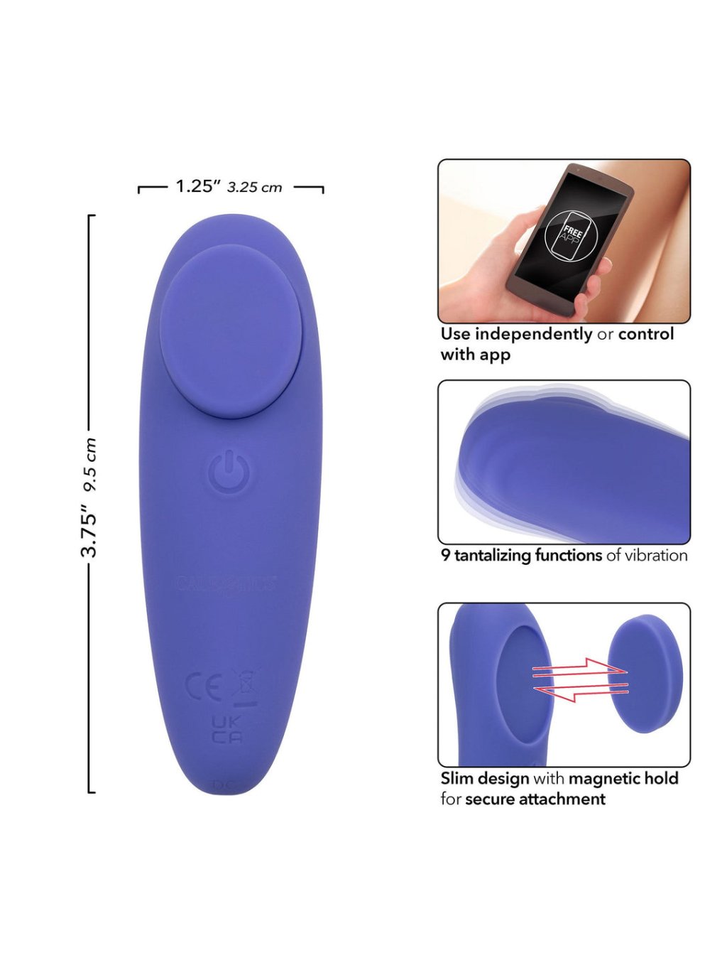 Experience a new level of discreet pleasure with the CalExotics Connect Panty Teaser. This sophisticated product is designed for solo play or shared experiences and is easily controlled via a user-friendly app. Its sleek design with magnetic attachment ensures secure fixation, while the body-safe silicone and 100% waterproof construction allow for use in all situations. With 9 functions of vibration, pulsation, and escalation, you can customize the intensity to your liking. Thanks to the modern memory chip, the device remembers the last used function, and the safety travel lock ensures your moments remain private. The rechargeable battery provides up to 40 minutes of operation on high speed and 60 minutes on low. Discover new dimensions of pleasure with the CalExotics Connect Panty Teaser and enrich your intimate moments.Additional parameters