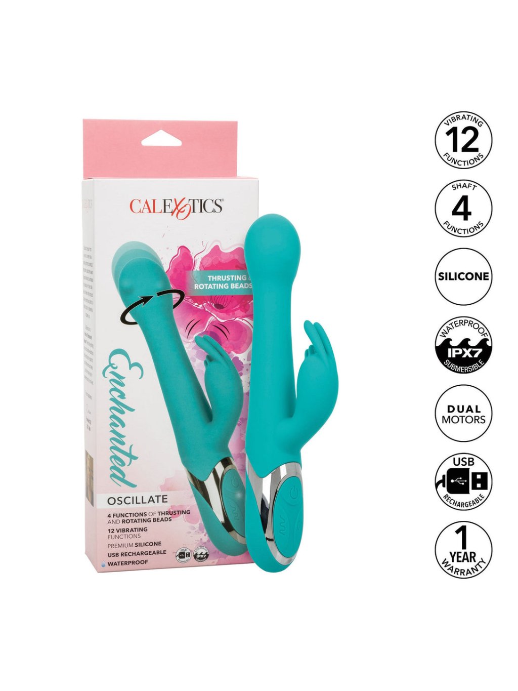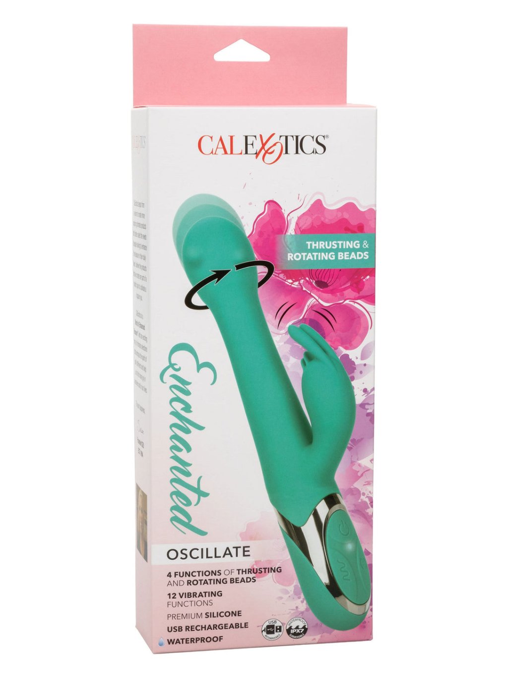 Introducing Enchanted Oscillate, a powerful dual stimulator that elevates personal pleasure to a new level. This product is designed to provide exciting experiences through a combination of advanced technology and user-friendly features. The head with moving and rotating beads along with a gently vibrating teaser offers dynamic sensations. With 4 functions of moving beads and 12 functions of vibrations, pulsations, and escalations, the stimulator allows you to enjoy diverse pleasures.Made from body-safe silicone and completely waterproof, allowing use in water. The integrated memory chip allows you to continue stimulation where you last left off, and simple button controls enable easy use. The stimulator is USB rechargeable, with a full charge in 1.5 hours allowing up to 40 minutes of operation on high speed or 50 minutes on low.