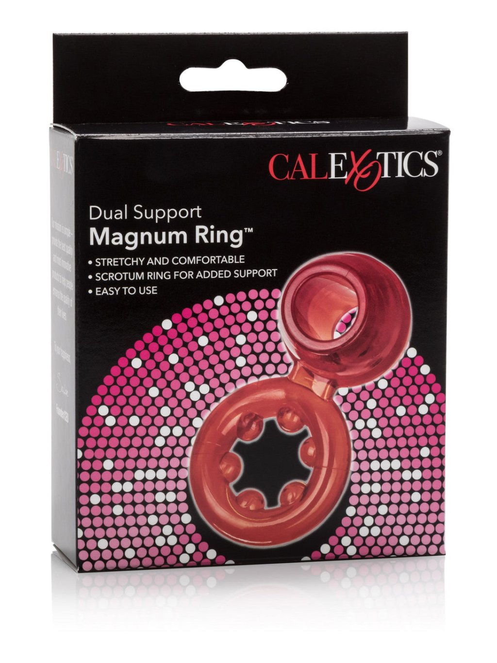 Enjoy maximum support for extended pleasure with the dual support Magnum Ring. The compact enhancer is ultra stretchy, extra wide, and features additional testicle support for sensual stability and increased satisfaction. Slip on the support ring and enjoy unlimited stimulation that promotes prolonged ecstasy. The dual erection enhancer has discreet dimensions of 8 cm x 4 cm x 4 cm and is made from highly stretchy and flexible, odorless TPE. The erection sleeve slides onto the penis erection and is placed at the base, attached to a flexible ring with bumpy protrusions that comfortably wrap around the testicles for exceptional supportive support. Always use a quality lubricant with this toy to enhance sensitivity and arousal. The erection enhancer is comfortable to wear and great for spontaneous and extended intimate play. The easy-to-use erection enhancer offers complete freedom of movement and is suitable for beginners and experienced users alike. Enhance your orgasmic experiences by wearing this support ring that adapts to your size and extends your erotic explorations. Add the reusable ring to your toy collection and enjoy unlimited explosions of pleasure at every opportunity. Clean the support ring with a toy cleaner or rinse in mild soapy water before and after each use.Additional parameters