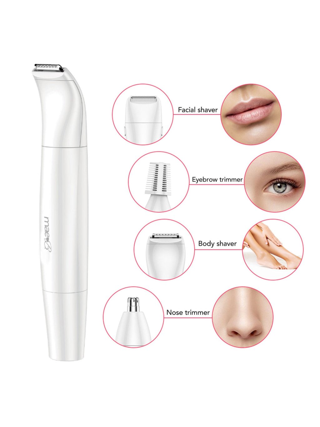 Mae B's all-in-one women's shaver allows you to precisely trim facial and body hair. The ergonomically shaped handle provides optimal control and comfort in use. The non-allergenic stainless steel blade removes hair effectively and safely. In the package you will find a complete set with four different attachments and a practical case for safe storage of the device and accessories. Material: ABS plastic | Stainless steel Manufacturer: Mae B Color: White Battery type: AA Battery included: No Number of batteries: 1 Water resistance: Waterproof