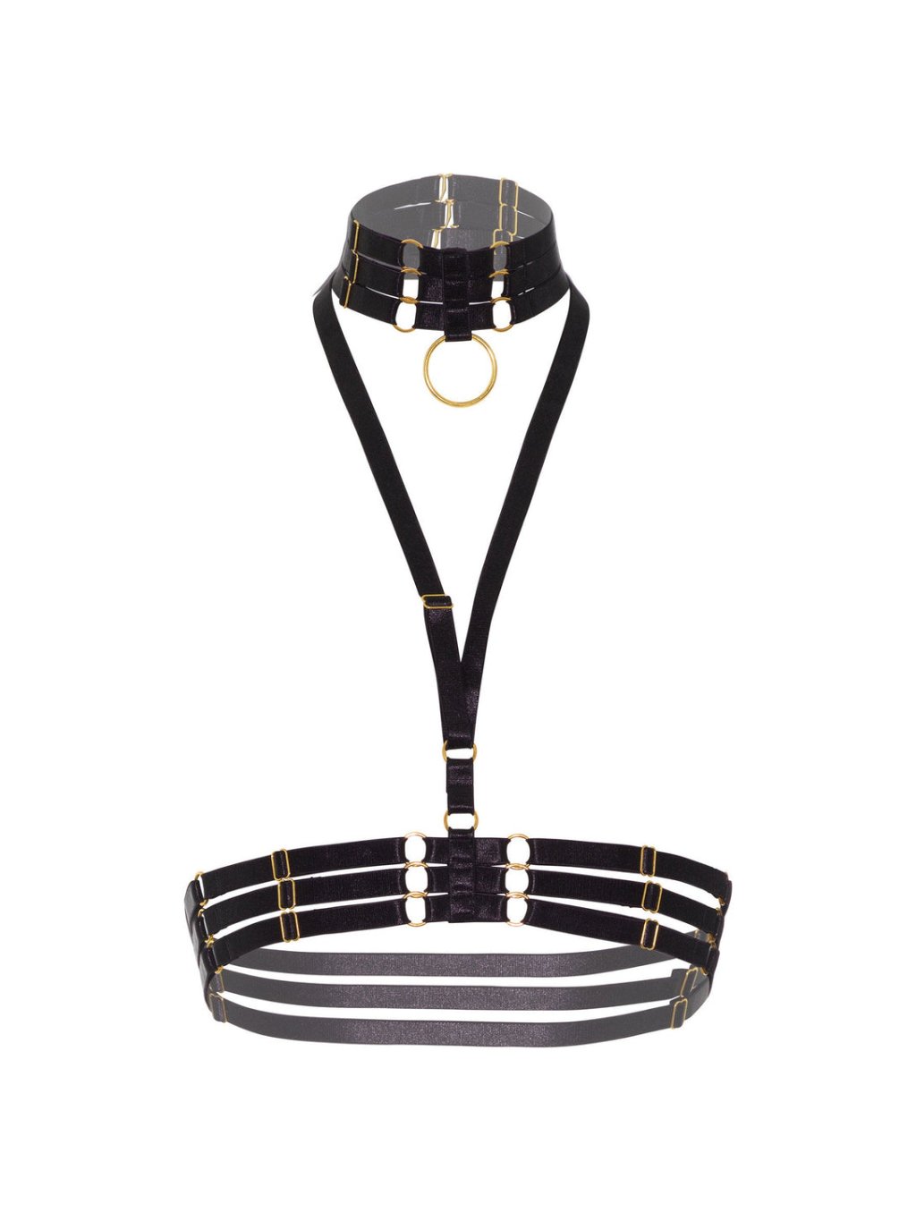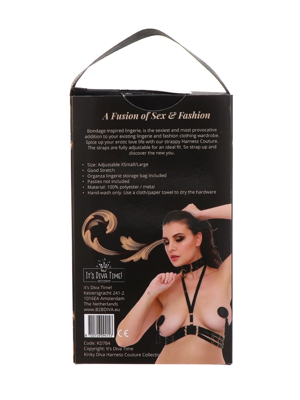 Luxurious harness made of elegant satin with elastic straps is not only sexy but also fully adjustable for maximum comfort and perfect fit. It can be worn during intimate moments, over a bra, or as a fashion accessory, for example, over a blouse. This piece is made of elastic polyester straps with gold-plated metal details. Hook closure. Hand washing is recommended, and gently dry the gold-plated details after washing. Size: One Size - the product is adjustable. Color: Black. Manufacturer: Kinky Diva.Additional parameters