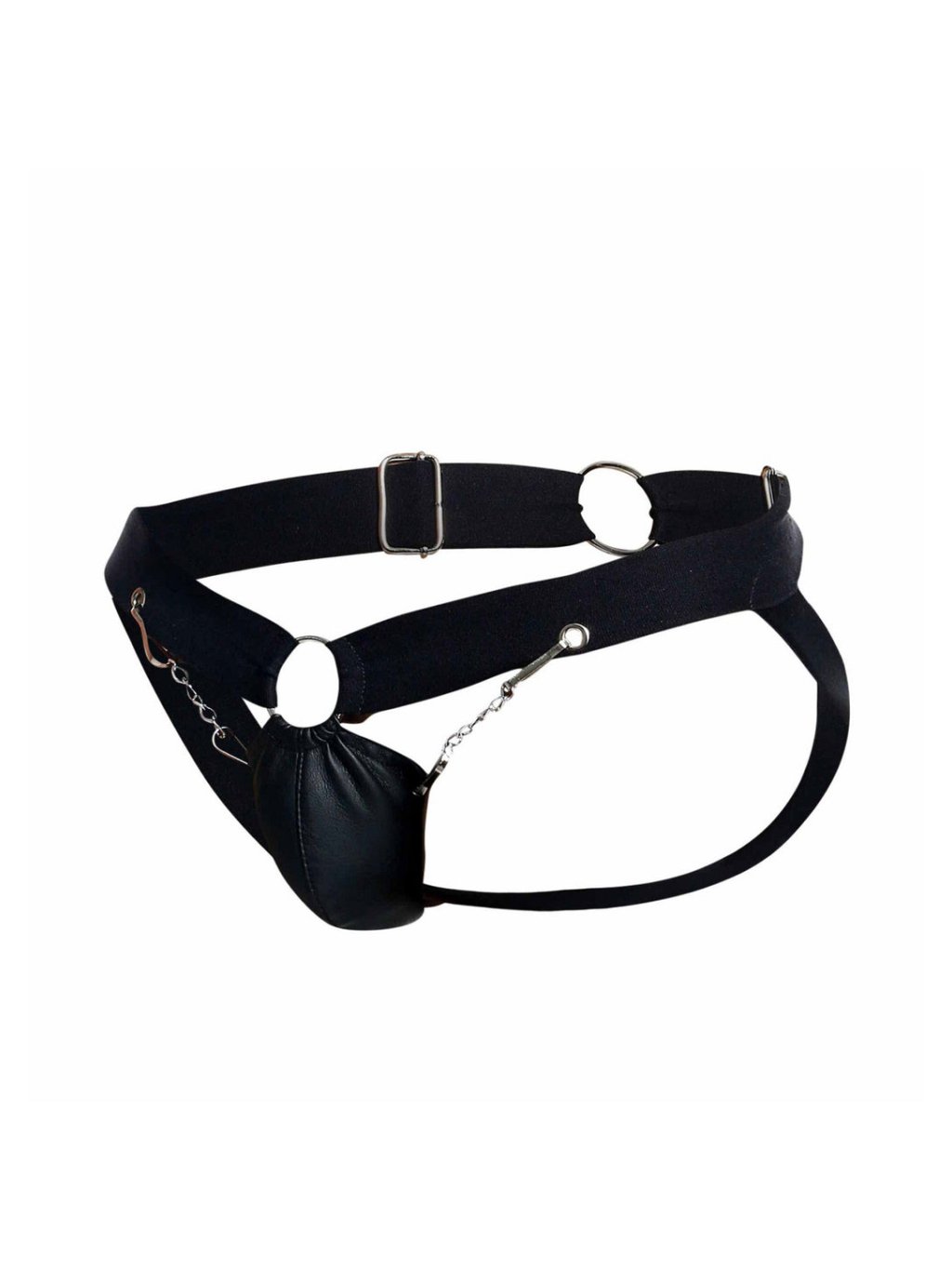 This chain jockstrap is made of sturdy faux leather in elegant black color. Thanks to minimal coverage at the back, sweat can evaporate better, providing the wearer with a more comfortable feeling. The front part with a chain cutout supports the penis without detracting from sexual appeal, while the wide straps on the sides ensure a firm hold. Manufacturer: MOB Eroticwear. Material: Faux leather and metal.Additional parameters