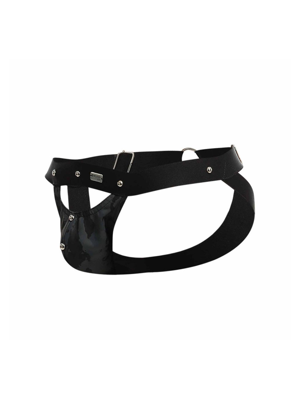 This elegant jockstrap takes the combination of sporty and sexy style a step further, offering you a style you'll love. It is a two-in-one combination - on one side, it's a revealing and comfortable piece of underwear, and on the other side, it's a jockstrap specially designed to provide additional athletic support in the front. With minimal coverage at the back and a breathable pouch in the front, it supports the penis without sacrificing charm.- Material: Faux Leather | Metal | 65% Polyurethane | 35% Rayon viscose