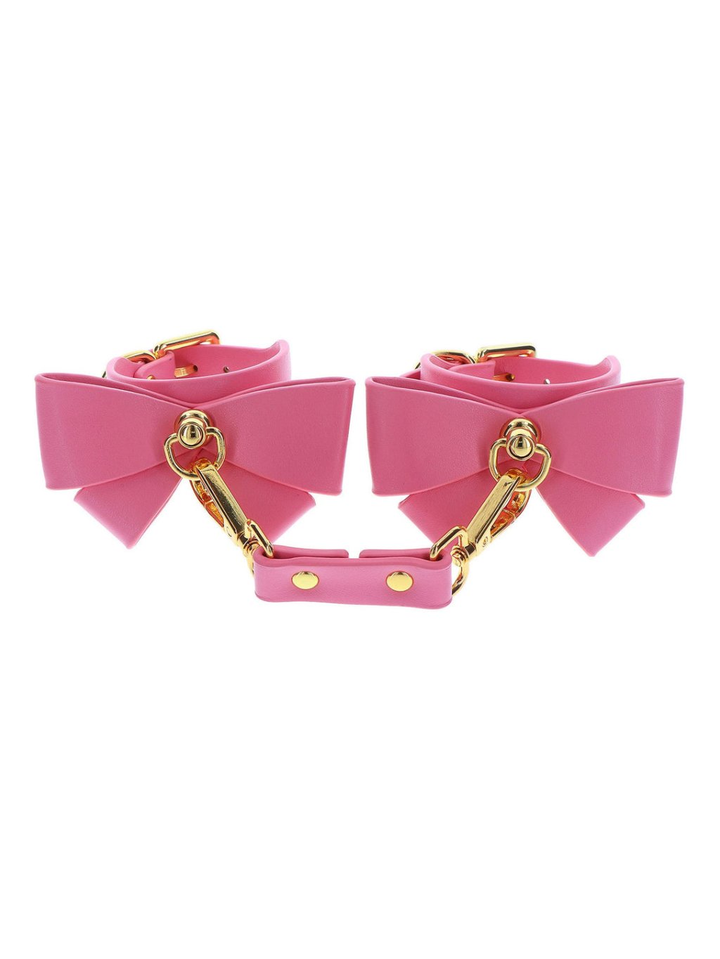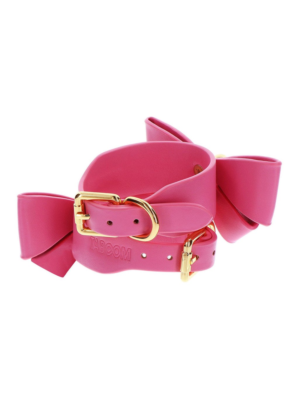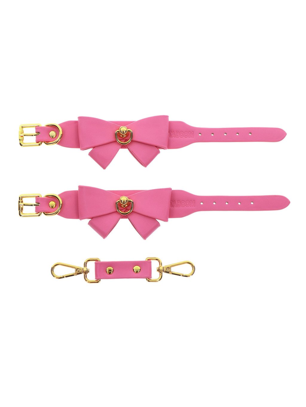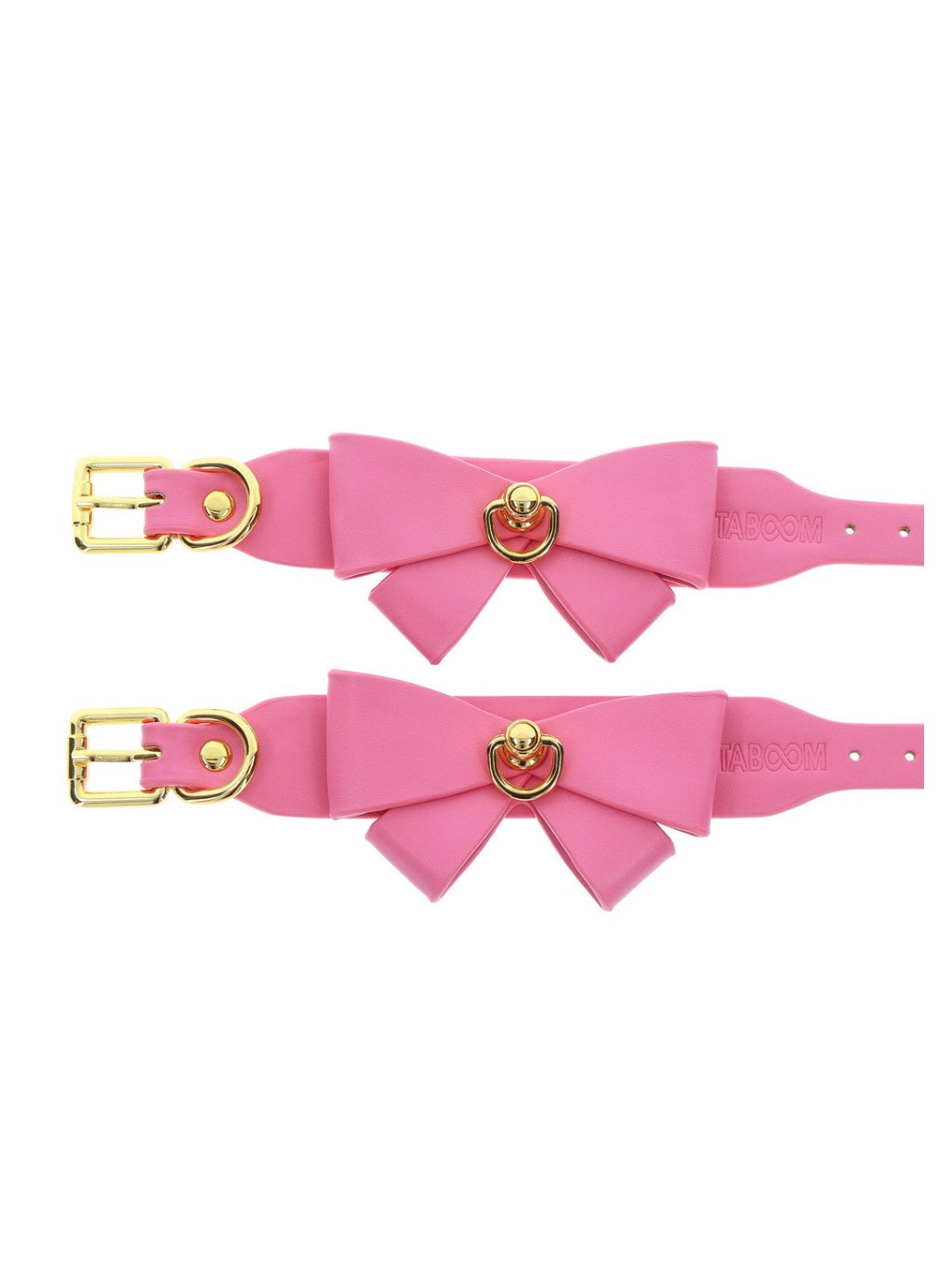 Enhance your bondage gear collection with Taboom Malibu wrist cuffs, which add a touch of cuteness and sexy look to your collection. Play with these pink cuffs made from vegan PU leather, adorned with a charming bow and enticing gold-plated metal details. Combine style and pleasure, explore the world of bondage, or wear them as a fashion accessory. With adjustable fastening, they ensure comfort and security during intimate moments. Solid buckles and rings allow for various play, offering endless possibilities for restraint and pleasure. Dive into passionate adventures and express your unique style with these exquisite wrist cuffs.Additional parameters