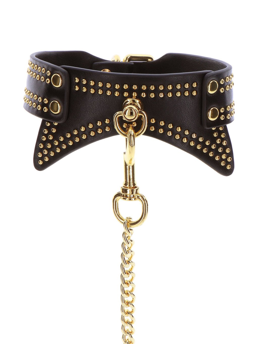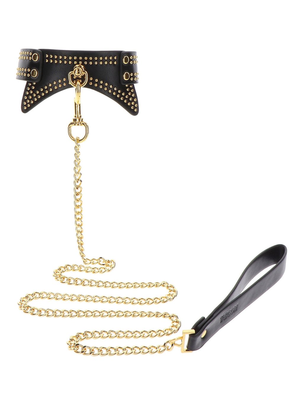 Collar and leash TABOOM are designed for those who wish to explore bondage and BDSM with unmatched style. This striking set includes an elegant black collar adorned with luxurious gold embellishments that exude an aura of sensuality, sophistication, and allure. Made from very soft vegan PU leather, this collar ensures comfortable intimate restraint. Allow your partner to lead you around or explore new, naughty experiences that will ignite your passions like never before. It offers a secure and adjustable fit for various neck sizes, ensuring a satisfying experience for all. Embrace the art of bondage in a way that embodies grace and allure with this TABOOM collar and leash set.Additional parameters