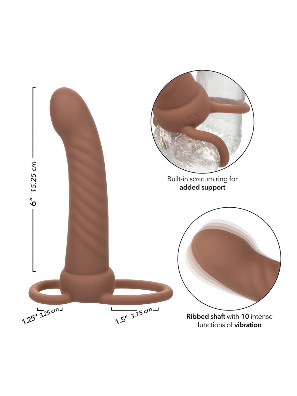 | Wymiary produktu: | 15.25 cm x 3.75 cm (probe) | 3.25 cm (diameter - shaft ring) | 3.75 cm (diameter - scrotum ring) |