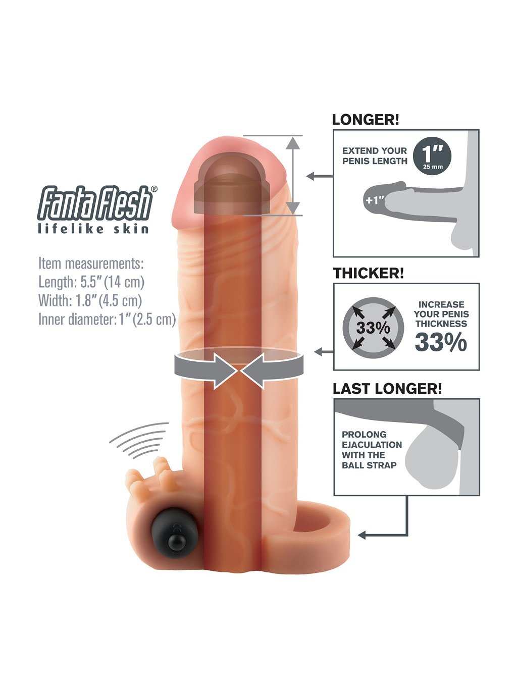 Fantasy X-tensions zamienia twój penis w natychmiastową maszynę do przyjemności z niesamowitymi wynikami. Ten łatwy w użyciu erekcyjny wzmacniacz pozwoli ci być najlepszym mężczyzną dla twojego partnera. Opracowany jako bezpieczna, przystępna cenowo i niechirurgiczna alternatywa dla drogich procedur medycznych i tabletek, twój Fantasy X-tension zapewni ci największe, najgrubsze i najprzyjemniejsze narzędzie do przyjemności, jakie możesz sobie wyobrazić! Idealny dla mężczyzn z zaburzeniami erekcji i problemami z wydajnością, twój nowy wzmacniacz przyniesie wyniki, które oboje partnerzy pokochają! Zwiększ przyjemność dla obojga i natychmiast dodaj centymetry z Wibrującym przedłużeniem The Vibrating Real Feel 1'. Z paskiem na jądra mocno przymocowanym wokół ciebie, przedłużysz ejakulację do najbardziej eksplodującego szczytu, jaki kiedykolwiek sobie wyobrażałeś. Twój partner będzie cieszył się głębszą penetracją z przedłużeniem 1' na końcu, podczas gdy ultra-realistyczny trzon pogrubi cię o 33% na całej długości. Potężny wodoodporny mikro wibracyjny silnik przyniesie jeszcze więcej ekscytacji, podczas gdy małe stymulatory łechtaczki dostarczą intensywne podniecenie bezpośrednio na najbardziej wrażliwe miejsce twojego kochanka. Ten realistyczny nasadek jest super elastyczny i dopasuje się do większości rozmiarów, jest wystarczająco ciasny, abyś wytrzymał dłużej, a super miękki materiał Fanta Flesh będzie się czuł jak druga skóra - tylko lepsza! Wypróbuj go pod prysznicem lub w spa i zamień kąpiel w czas przyjemności! Po zabawie łatwo jest posprzątać za pomocą dołączonego środka czyszczącego do zabawek i ciepłej wody. Jeden rozmiar pasuje do większości. To nie jest prezerwatywa. Materiał: TPE | ABS Grupa materiałowa: TPR / TPE Producent: Pipedream Kolor: Jasny odcień skóry Typ baterii: ["AG13 / LR44"] Baterie w zestawie: Tak Liczba baterii: 3 Wodoodporność: Wodoodporny
