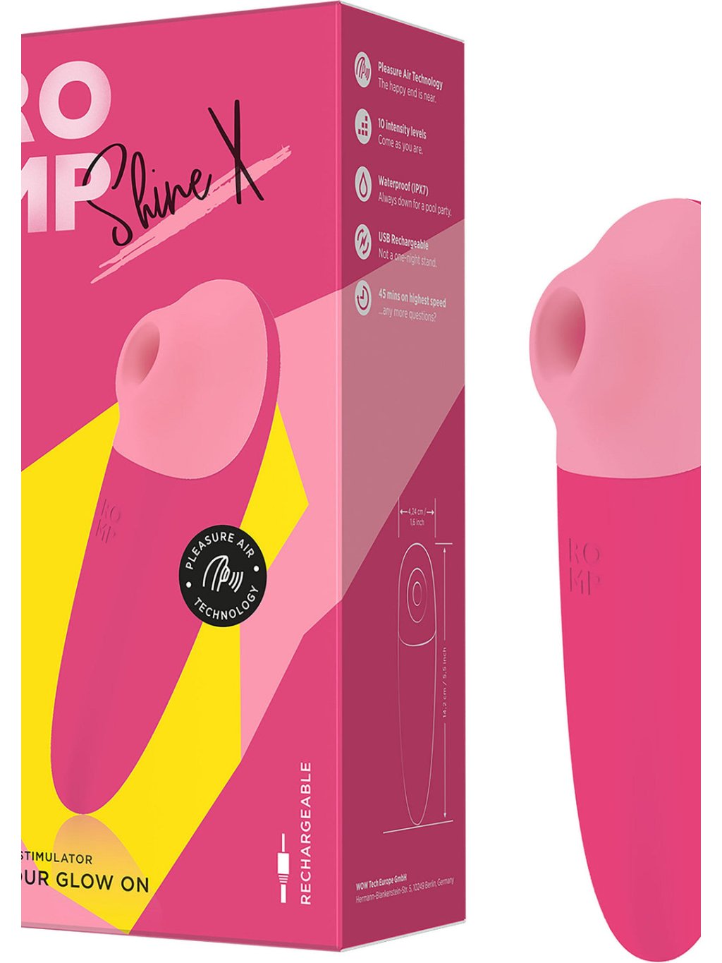ROMP Shine X představuje revoluční stimulátor klitorisu, který využívá inovativní technologii Pleasure Air pro intenzivní a jemné vzrušení bez přímého kontaktu. Tento elegantní přístroj je vyroben z bezpečného silikonu bez ftalátů a latexu, což zaručuje bezpečné použití. Díky své vodotěsné konstrukci (IPX7) je Shine X ideální společník do sprchy nebo bazénu, kde můžete prozkoumat všechny své fantazie bez obav. S deseti úrovněmi intenzity nabízí Shine X širokou škálu možností pro dosažení maximálního uspokojení, což umožňuje uživatelům přizpůsobit zážitek svým osobním preferencím. Navíc díky USB nabíjecí funkci a výdrži až 45 minut na maximální rychlosti je tento stimulátor vždy připraven k použití, kdykoli je to potřeba. Svou růžovou barvou a stylovým designem přináší Shine X nejen funkčnost, ale i estetickou hodnotu. Je to nejen hračka pro jednu noc, ale spolehlivý partner pro dlouhodobé potěšení. Ideální pro ty, kteří hledají kvalitu, výkon a styl v jednom balení.