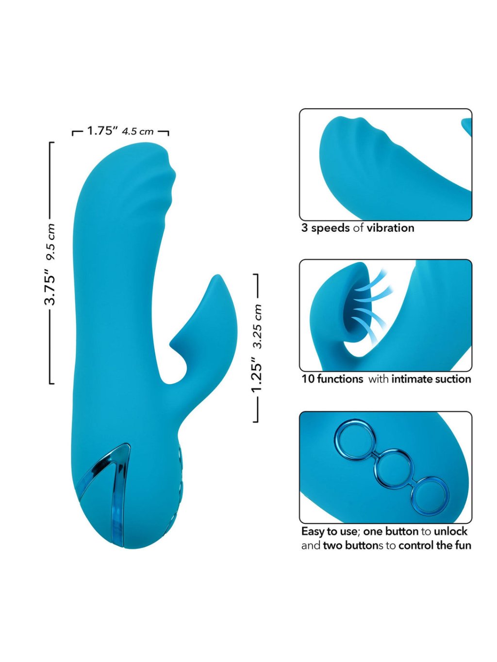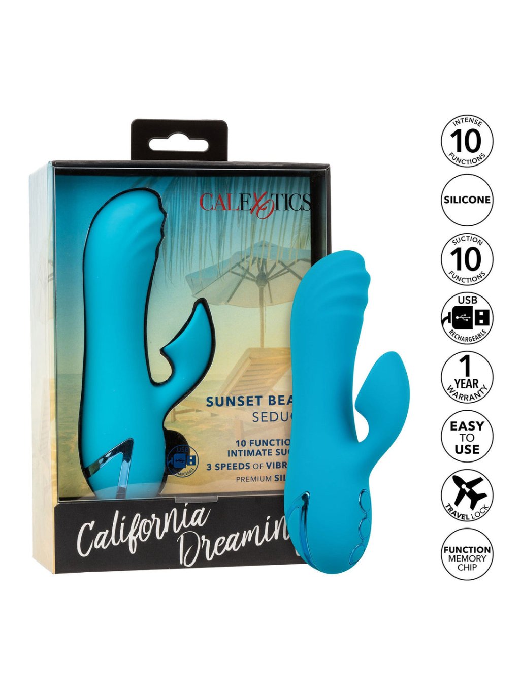 Ponorte sa do rozkoše s California Dreaming Sunset Beach Seducer, kompaktným stimulátorom navrhnutým pre intenzívne spojenie. Tento stimulátor kombinuje dvojité vibrácie a klitoriálne sanie, čo zaručuje vrcholné potešenie. Hlavica disponuje tromi rýchlosťami nezávislých vibrácií, pulzácií a eskalácií, ktoré sú doplnené desiatimi funkciami sania pre intenzívne senzácie. Vďaka dvom motorom poskytuje symfóniu rozkoše. Vyrobená z bezpečného silikónu, je hladká a univerzálna. Integrovaný pamäťový čip umožňuje plynulú hru a cestovný zámok zaisťuje bezpečnosť. Doba nabíjania cez USB činí 2,5 hodiny, pričom stimulátor ponúka 40 minút prevádzky na vysokej rýchlosti alebo 90 minút na nízkej. Zažite nekonečné momenty potešenia s týmto exkluzívnym stimulátorom od CalExotics.- Mocný, kompaktný, vibračný dvojitý stimulátor s klitoriálnym saním