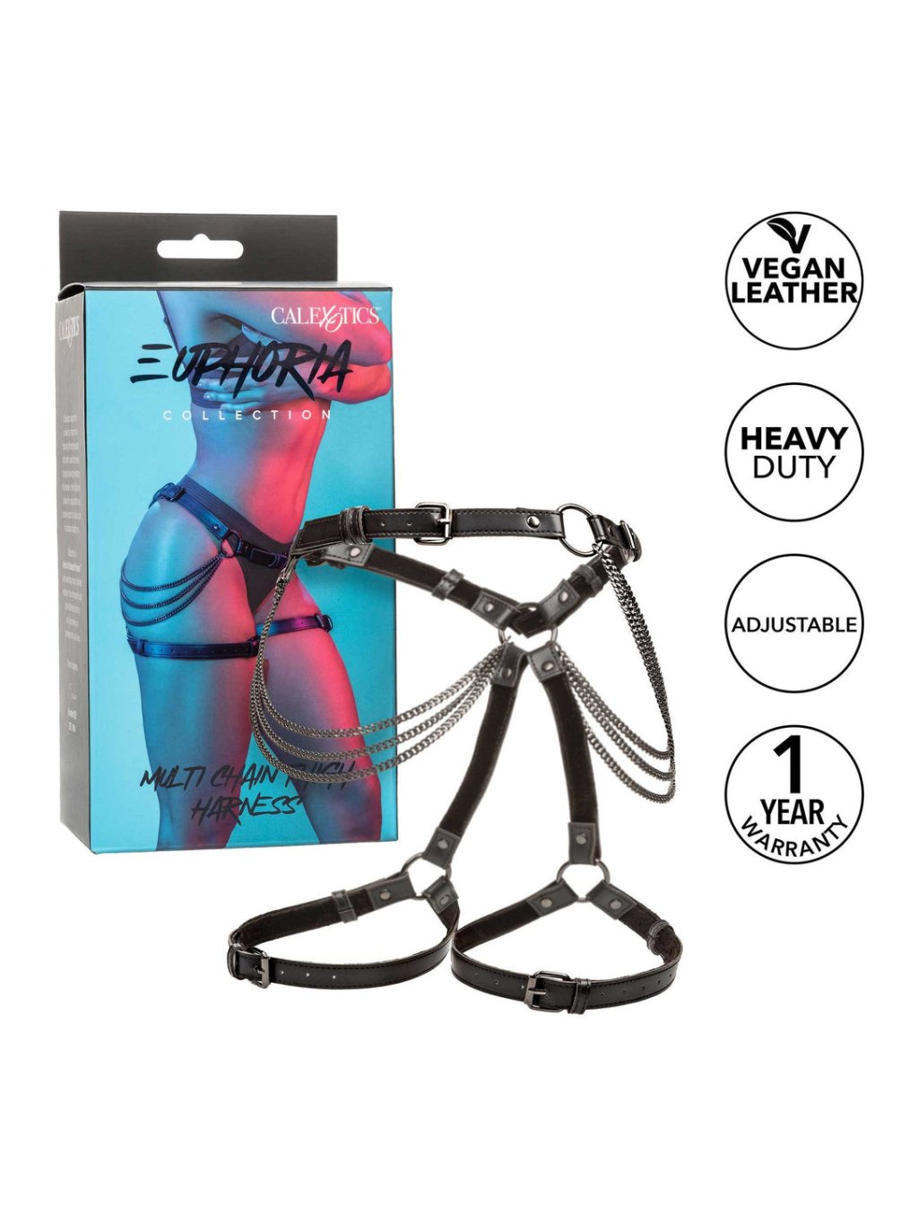 Zvýšte svoje potešenie s Euphoria Collection Multi Chain Thigh Harness - exkluzívnym doplnkom pre zvýšené túžby. Ideálny pre intímne okamihy alebo festivalový šarm, tento stehenný popruh vytvára odvážne prehlásenie. Ľahko nastaviteľné pásové a stehenné popruhy zaisťujú pohodlné nosenie s prackou. Súčasný dizajn zvyšuje odolnosť a celkovú spokojnosť. Užite si luxusný pocit mäkkého zamatu vnútri a sofistikovanosť exteriéru z vegánskej kože. Pevná konštrukcia s dvojitým polstrovaním a prešívaním zaisťuje pohodlie počas vášnivých stretnutí. Nevyrývajúce kovové doplnky pridávajú glamour a vytvárajú vizuálne úchvatný dojem. Univerzálny dizajn padne väčšine veľkostí. Rozviažte svoje túžby s Euphoria Collection Multi Chain Thigh Harness.