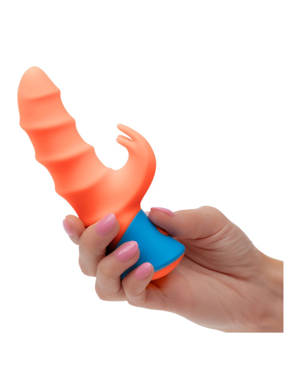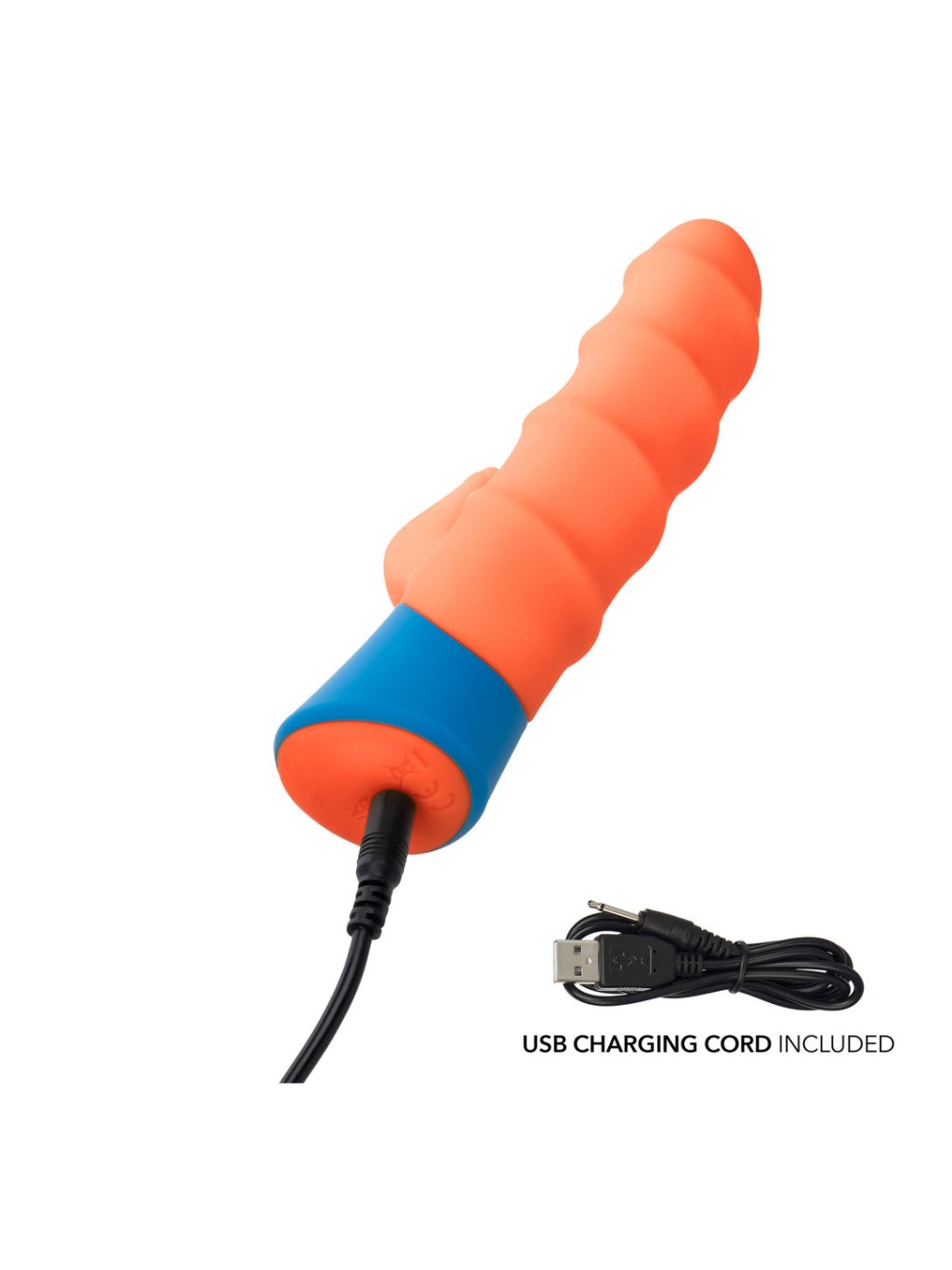 CalExotics Rave Tickler Vibrator – ORANGE kombinuje špirálovito tvarovaný hriadeľ pre výraznú vnútornú stimuláciu a tri pulzujúce ticklery, ktoré poskytujú dráždivú a teasingovú vonkajšiu stimuláciu.
