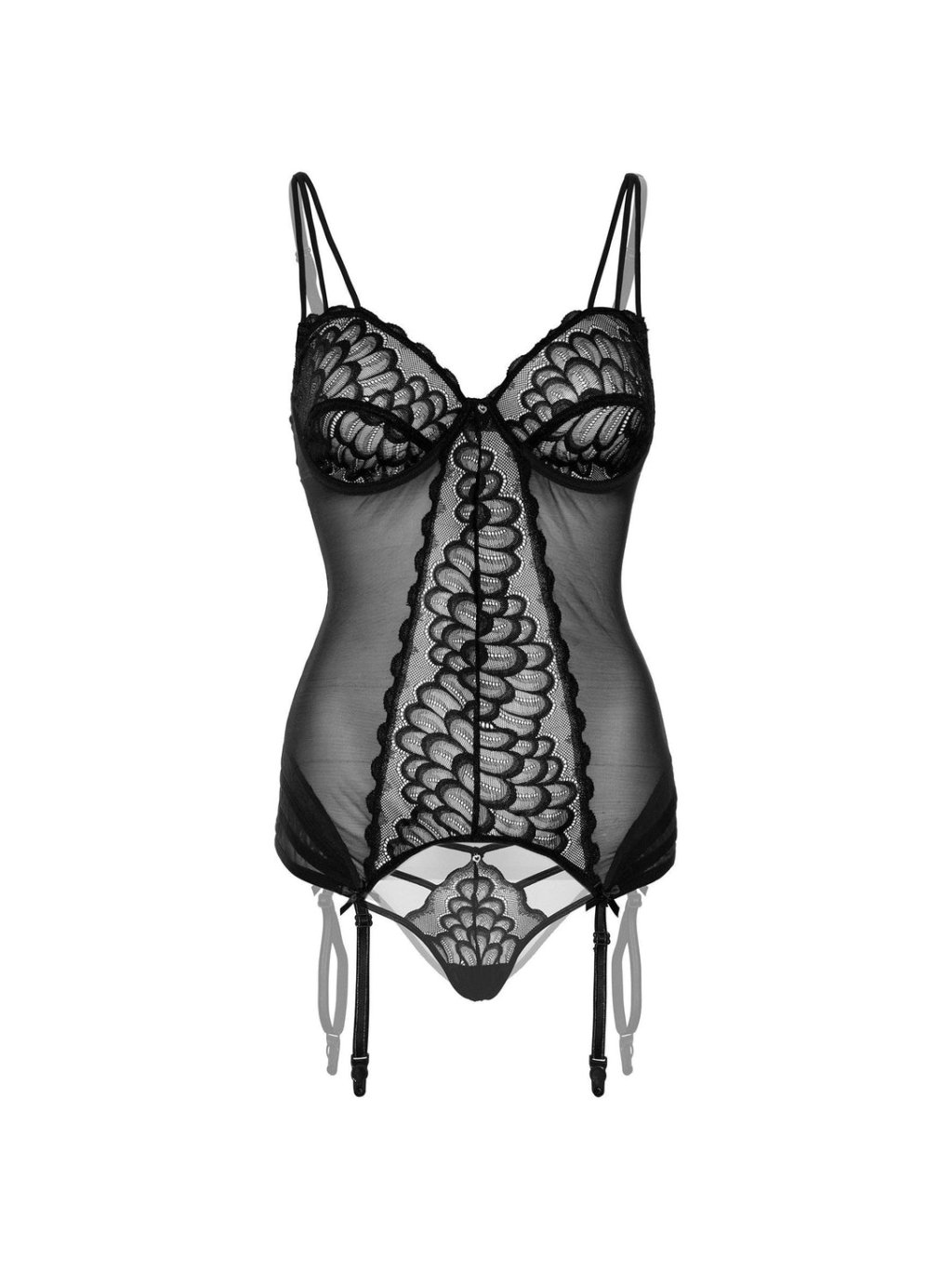 Krásna krajková korzetová košieľka s mašľou, vyrobená z luxusnej krajky, s dekoratívnymi prednými popruhmi, detailmi v podobe diamantov, otvoreným chrbtovým dielom, nastaviteľnými ramienkami, zapínaním 3x2 háčiky a očkami vzadu a s priloženými tangá nohavičkami. Materiál 95% polyester a 5% elastan. Výrobca: Daring Intimates. Farba: čierna. Odporúčané pranie: Ručné pranie. Nenášľapujte. Nenoste v sušičke. Neprehrievajte. Neperte chemicky.Dodatočné parametre