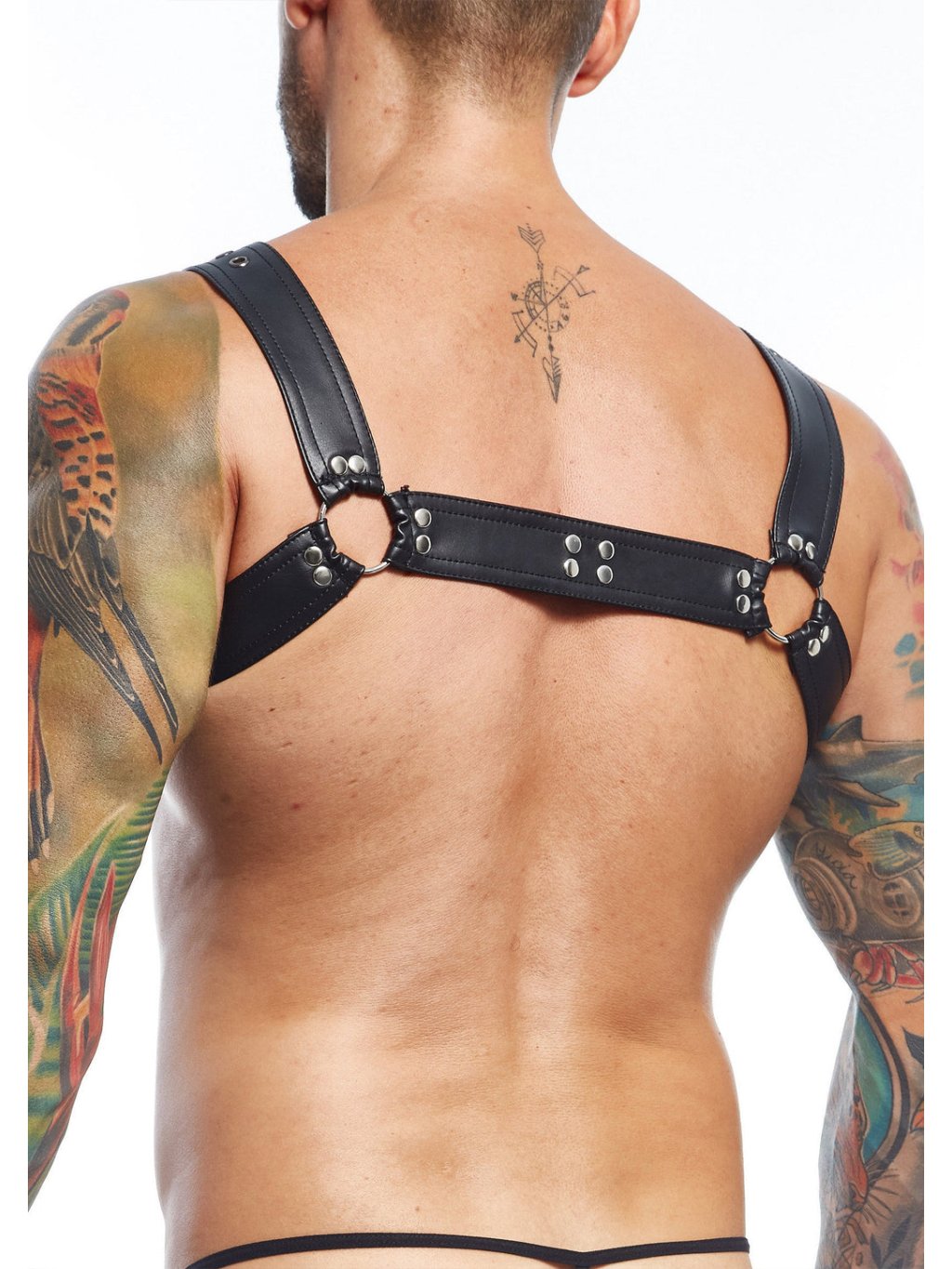 Snap Jockstrap je vyrobený z pevnej falošnej kože v elegantnej čiernej farbe.