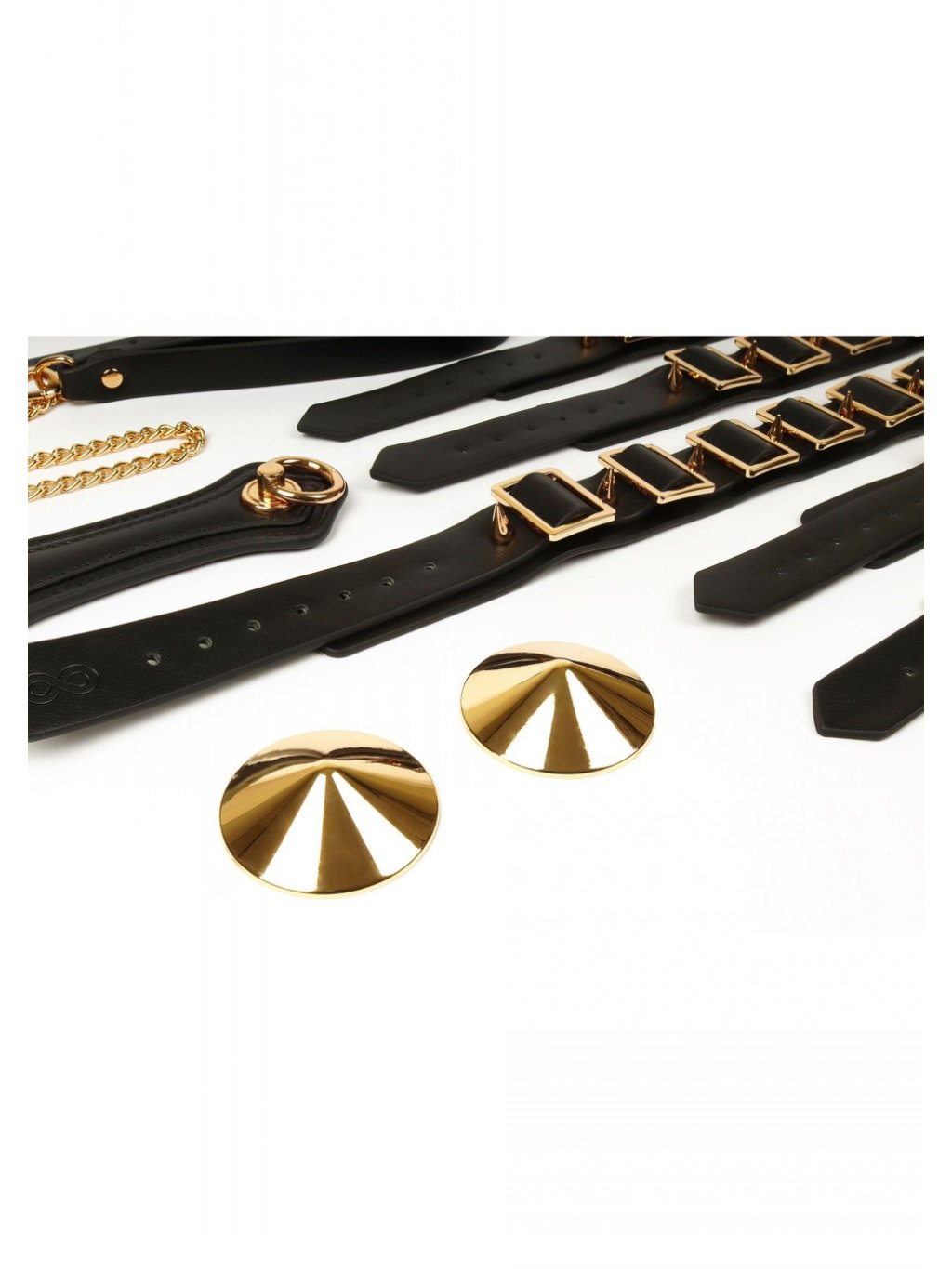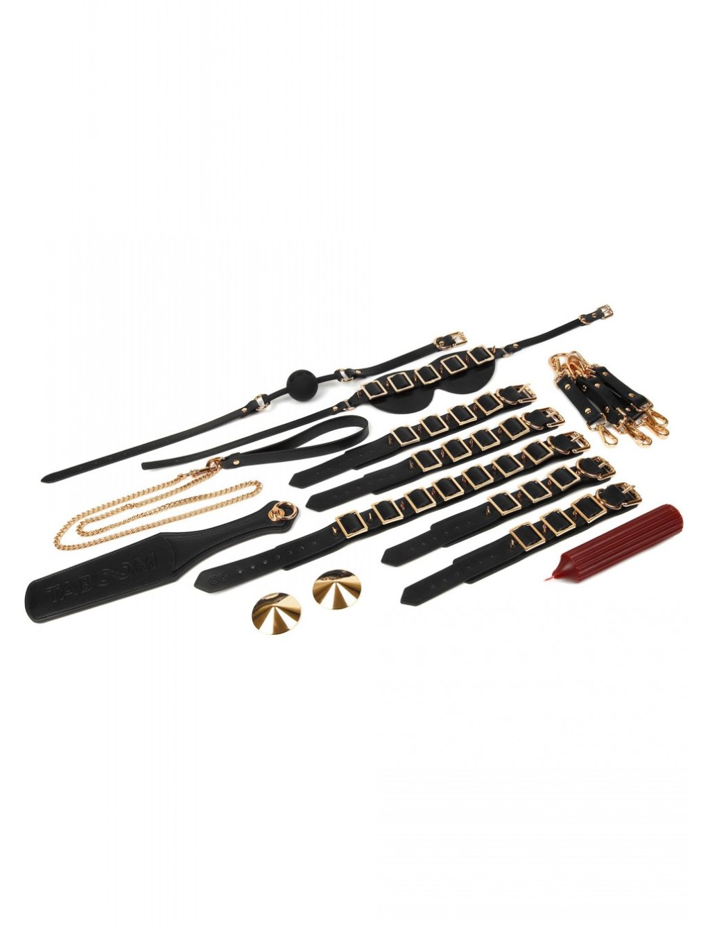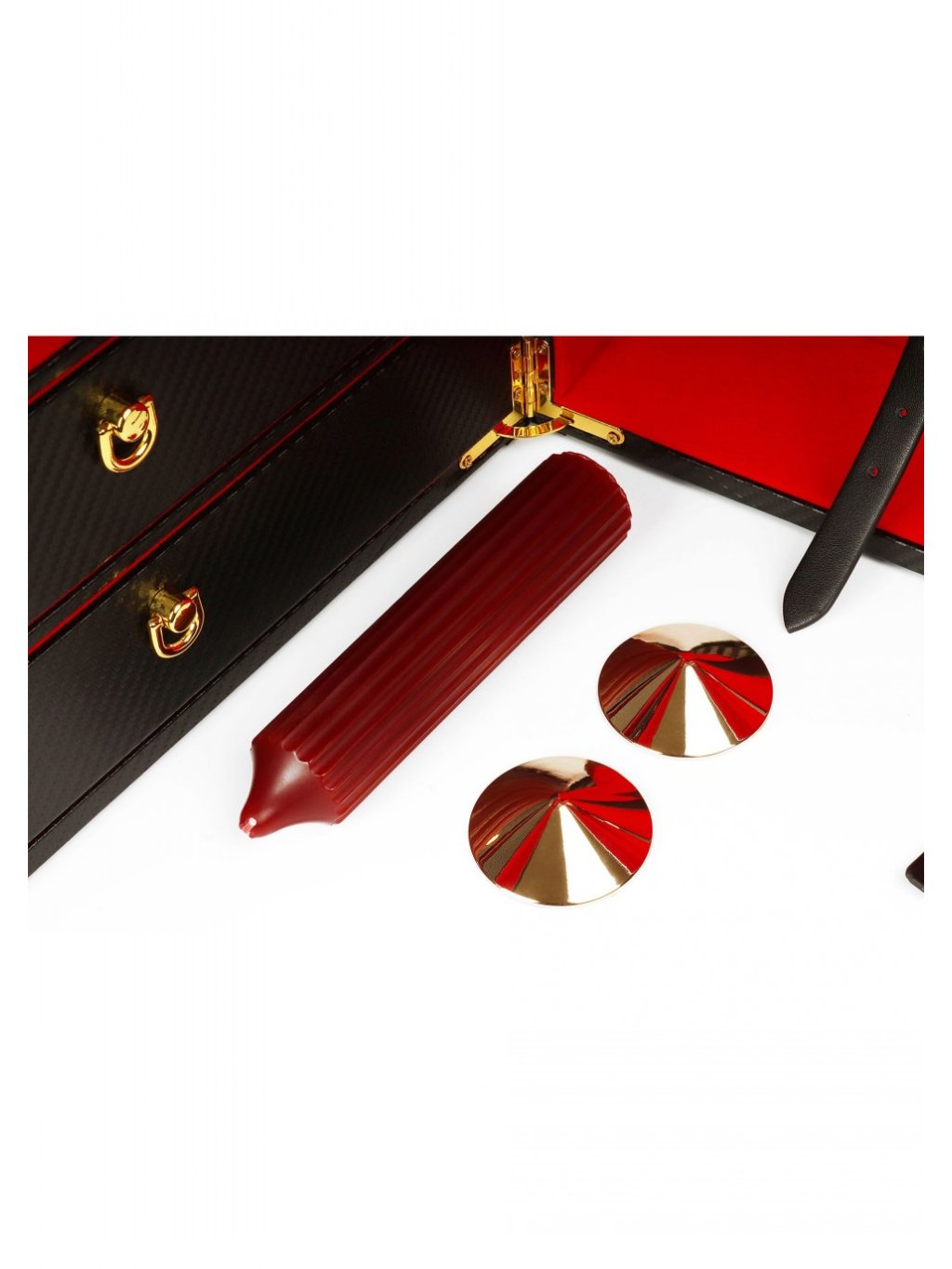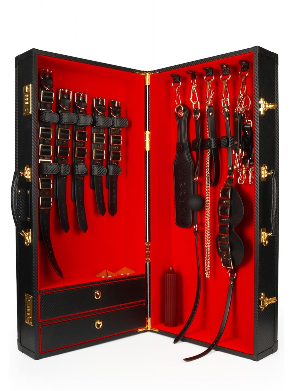 Uvnitř designového kufříku najdete vše potřebné pro smyslné experimentování: elegantní obojek s vodítkem, pouta na ruce i manžety na zápěstí, svůdnou masku na oči, roubík s kuličkou, hladkou plácačku, přitažlivé krytky bradavek a také BDSM svíčku pro hru s horkým voskem.